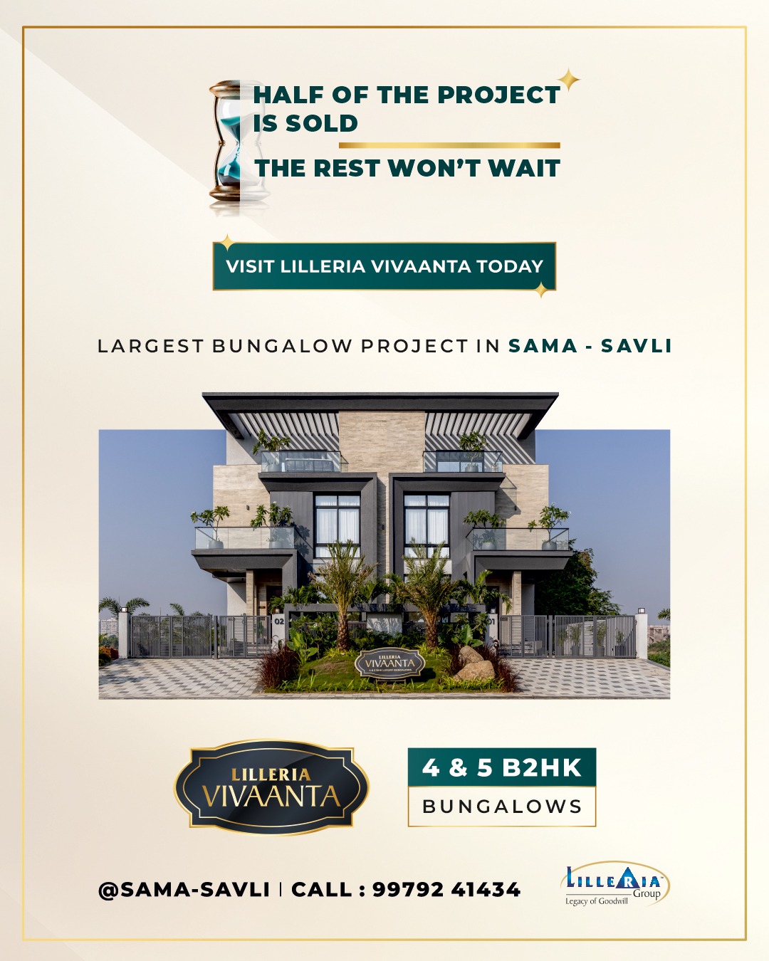 Lilleria Vivaanta is a premium gated community featuring 63 Ultra luxurious 4 & 5 B2HK bungalows, designed for an exclusive lifestyle. Strategically located at the entry of Vadodara city on an 18-18-12 meter road in Sama-Savli, it offers seamless connectivity—just 10 minutes from the airport. With over 20 world-class amenities, Vivaanta redefines luxury living, blending elegance, comfort, and convenience in a serene environment.